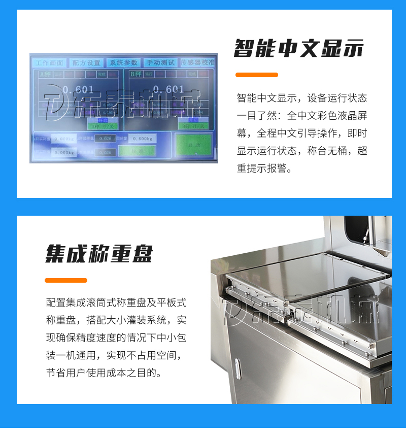 5. 該設備配備四頭(大小兩組)雙泵,凈重/毛重、自動/手動功能一鍵切換,進一步滿足客戶精度,速度,低投資需求。