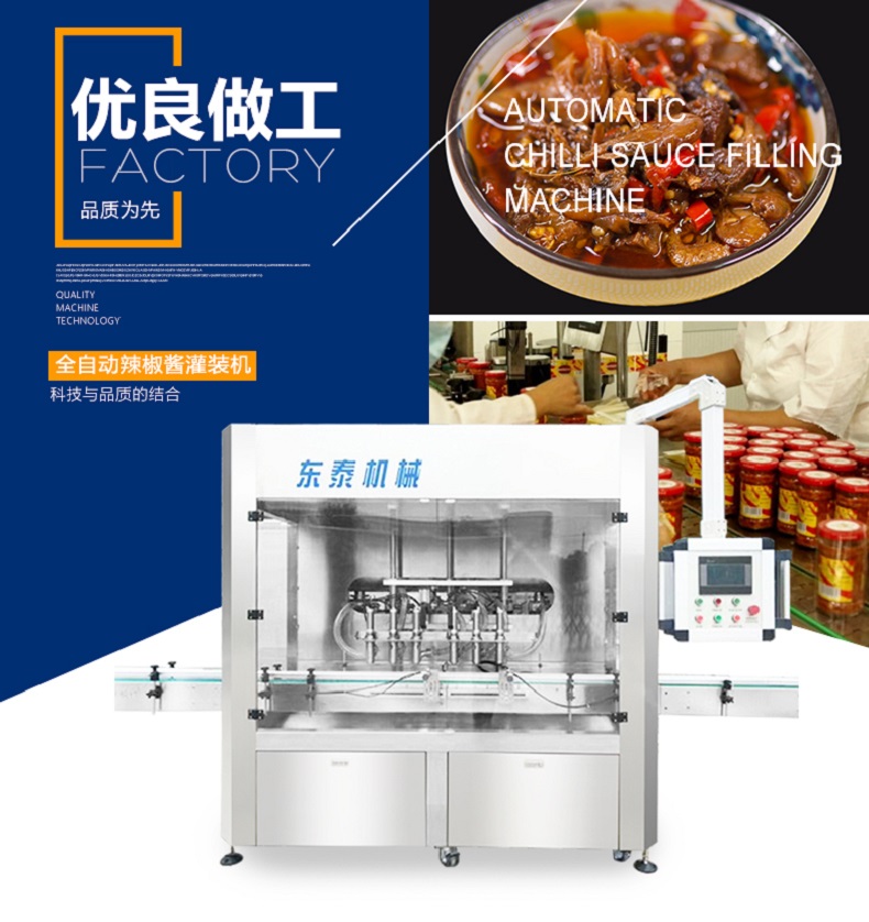 全自動辣椒醬類醬體灌裝生產(chǎn)線作為公司新研發(fā)的灌裝設備在市場上起到了關(guān)鍵性的作用,獨特的技術(shù)讓整個包裝市場變得富有生命力,是集光,機,電,氣于一體,采用活塞式定量原理,灌裝精度高,操作簡單,維護方便,設備主要材質(zhì):采用SUS304不銹鋼制造,符合衛(wèi)生要求.灌裝過程采用亞克力透明板與外界隔離,保證灌裝的衛(wèi)生要求。灌裝采用壓力式灌裝,無需配裝高位罐,簡化了安裝工序,提高了灌裝效率?蓮V泛應用于食品、醬料行業(yè)產(chǎn)品的自動化包裝生產(chǎn)。幾乎能夠灌裝所有醬類、醬料物體是該款全自動辣椒醬類醬體灌裝生產(chǎn)線最大的優(yōu)勢,包括大塊肉醬、顆粒醬、濃醬、豆瓣醬、甜面醬、辣椒醬等。