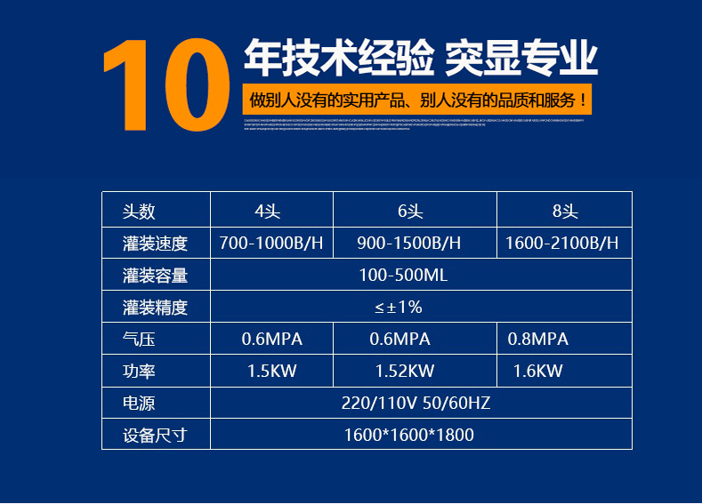 設備特點: 1、快速清洗、便于調(diào)整、容積缸體動作無極調(diào)速,適合不同規(guī)格、不同物料的灌裝。充填量一次調(diào)整完畢,每個容積缸體可分別微量調(diào)節(jié),灌裝精度高且一致性好。接觸物料的材料為316不銹鋼、硅橡膠、符合QS規(guī)范。 2、進口減速電機無極調(diào)速控制灌裝柱塞缸,不僅適合各種膏體,亦適合醬料。 3、進口電磁離合器和電磁制動器配合動作,消除慣性,灌裝精度高。 4、人機界面與PLC通訊,調(diào)試設備或更換品種只需在屏幕上設定。進瓶、定位、灌裝充填、出瓶均自動作業(yè)。 5、灌裝時瓶子不到位、瓶子堵塞活出液管沒有插進瓶子時設備將自動保護,排除后繼續(xù)作業(yè)。