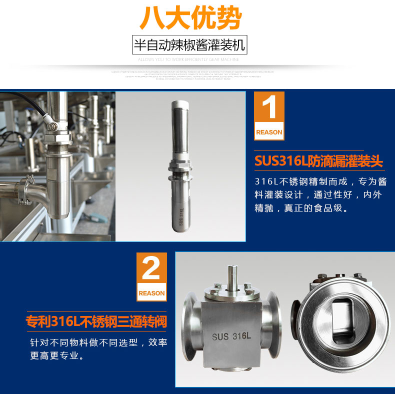 適用范圍:小型辣椒醬灌裝機主要適用于那些含顆粒的顆粒漿狀流體、半流體、膏體、醬狀類的物料灌裝,各種勻質(zhì)醬料、火鍋底料、老干媽辣椒醬、干煸牛肉醬、泡椒、牛肉粒醬、香菇丁醬、八寶菜、蘿卜丁、含干煸臘肉丁、辣子雞丁、油炸花生等大顆粒、含油量少等干煸辣椒醬的灌裝。
