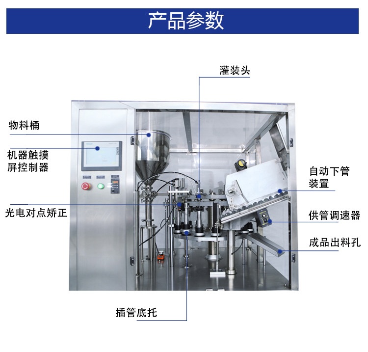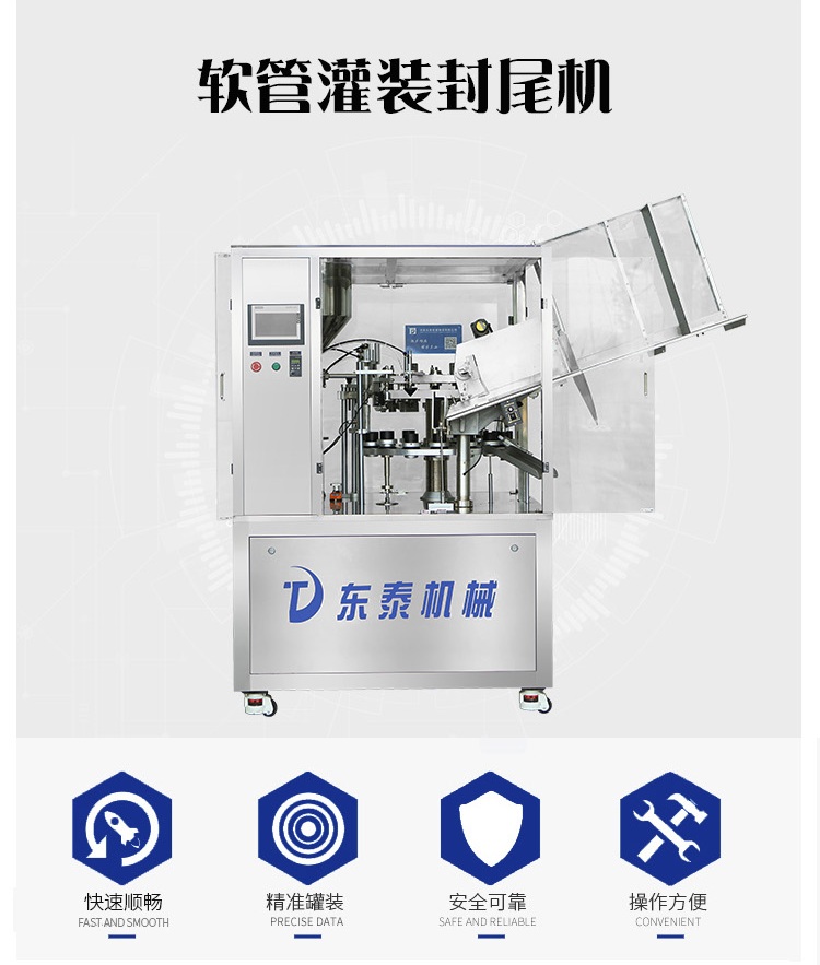 適用于醫(yī)藥、食品、化妝品、日用化工用品等行業(yè)的塑管、鋁塑復(fù)合管灌裝封尾需要?蓪⒏鞣N糊狀、膏狀、粘度流體等物料順利準(zhǔn)確地注入軟管中,并完成管內(nèi)熱風(fēng)加熱、封尾和打批號、生產(chǎn)日期等。