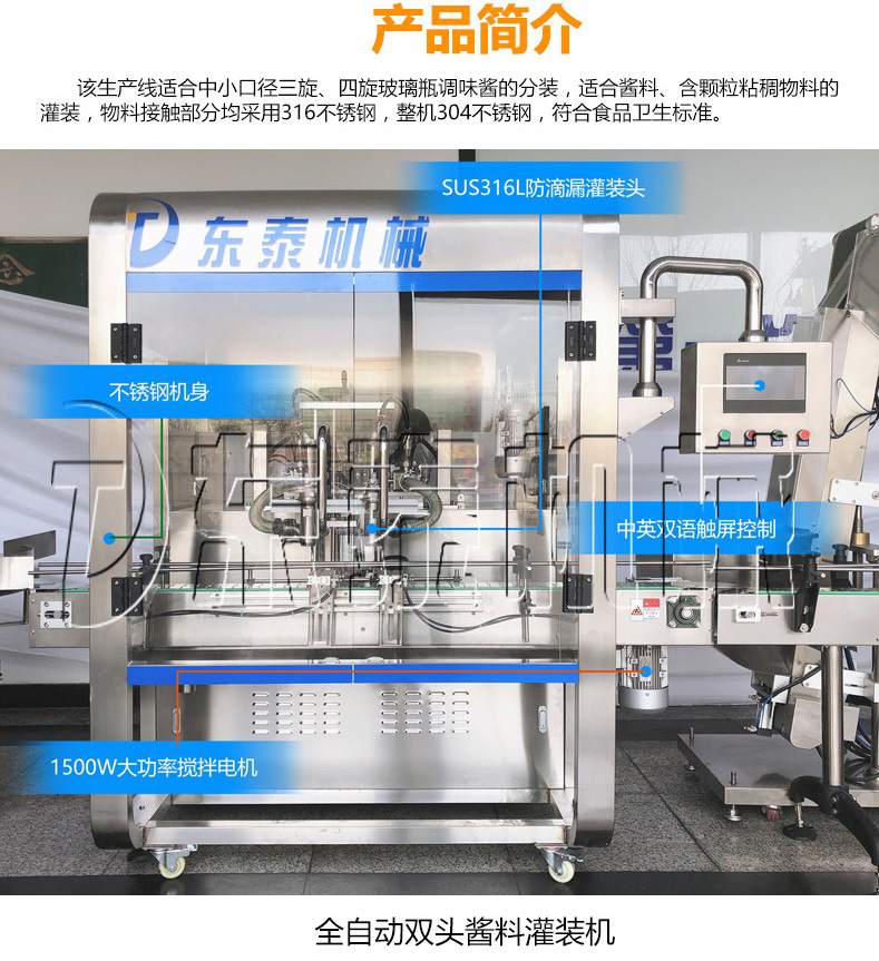 該機為全自動醬類灌裝機,配有自動攪拌功能,使物料混合更加均勻 ,有效的解決灌裝誤差大的問題;本機輔料添加料可調(diào),精準方便,提高自動化程度。 醬類灌裝機氣動部分均采用氣動元件,壽命長,穩(wěn)定。 物料接觸部分采用SUS316L不銹鋼材料制成,符合食品醫(yī)藥安全衛(wèi)生要求。 灌裝閥由氣動閥控制,灌裝精度更高。 灌裝量和灌裝速度均可任意調(diào)節(jié)。 灌裝頭是我公司創(chuàng)新的灌嘴,可有效解決拉絲、滴漏問題. 該醬類灌裝機大小瓶調(diào)節(jié)方便,配置自動升降裝置。 采用集成理念設(shè)計,易損件少,方便企業(yè)維護保養(yǎng)。 該全自動醬類灌裝機設(shè)有無瓶不灌裝功能,不需更換零件,即可快速調(diào)整各種不同形狀規(guī)格的瓶子。